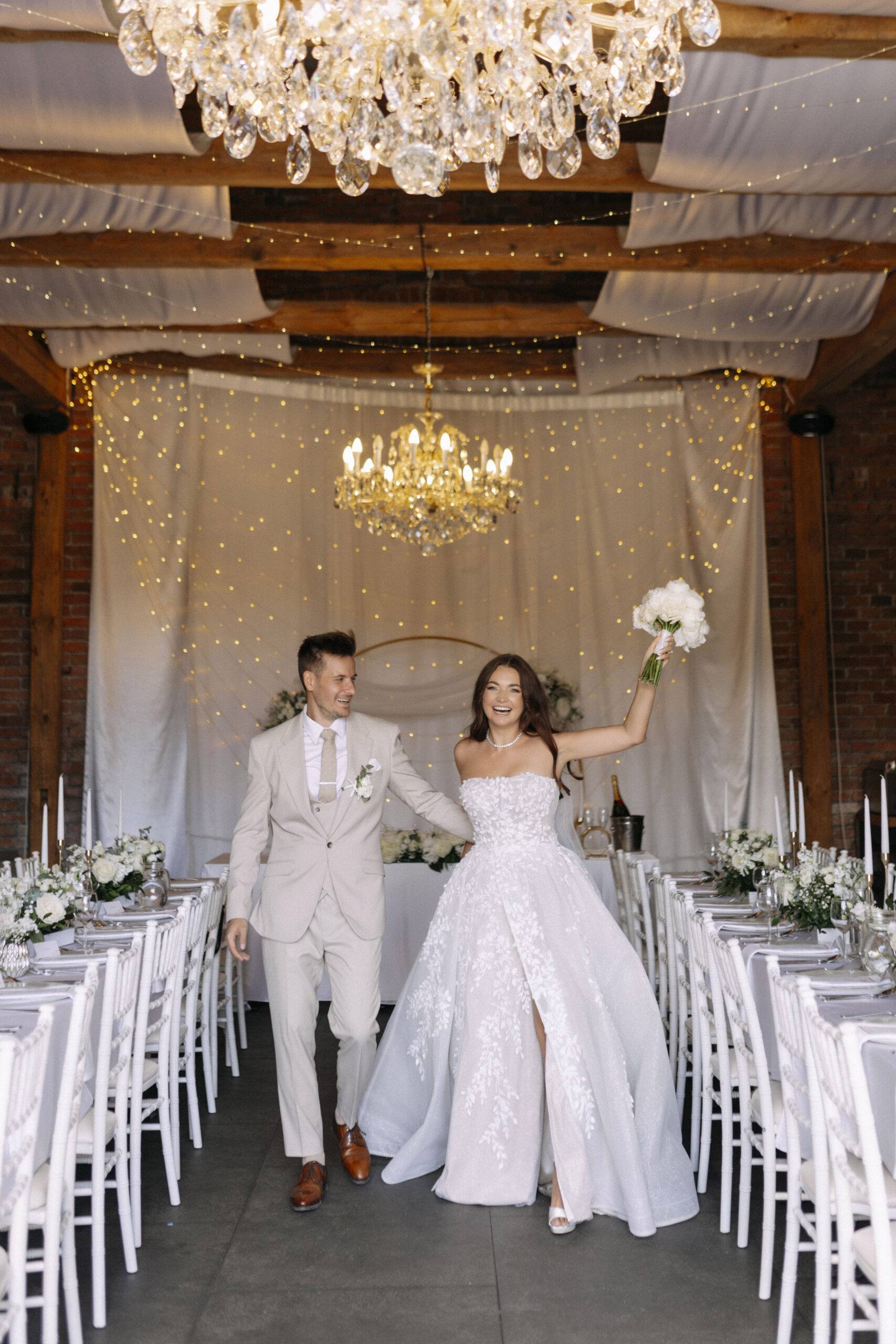 Dinner — The barn doors open to reveal your reception: exposed brick walls, crystal chandeliers, long tables set with care. Chef Karel serves a menu crafted just for you.